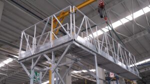 היתרון הגדול של פיגום עם מרפסת – היכולת לעבוד בדיוק מעל אזורי ייצור, שולחנות עבודה ומכונות מבלי להפריע לתנועה או לחסום שטחים קריטיים.